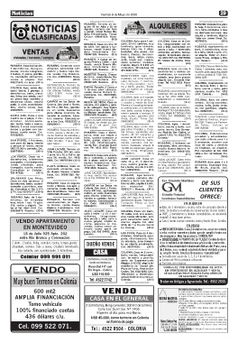 do. Consultas al Tel. 2 514 cocheras, vende Buena Ma- Colonia, San José o Flores, 099615711. Rosario.- (30-4) CLIENTES