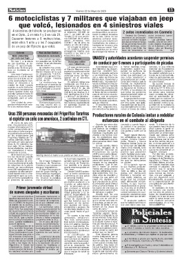 Piria, manifestaron la an- ejercicio de sus funcio- monitoreados.” animal que se faenó.” 4 siniestros de tránsito dejaron 13 lesionados: