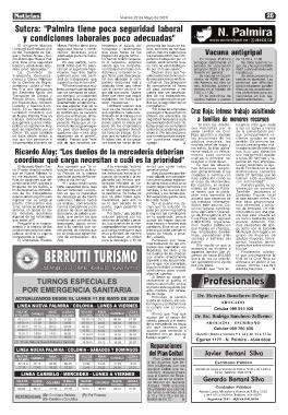 cra afirmó que “Nueva Pal- jadores.” no hemos tenido respues- pañeros trabajarían por un En Nueva Palmira de 13.00 a 17.00.