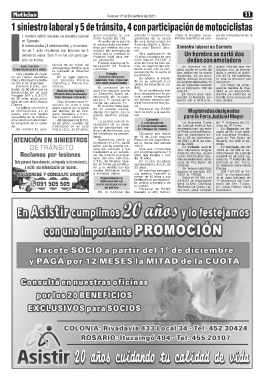 Se solicitó la asis- Fiat y J.E.C. de 57 años, en choque de motos encargaturas durante En Rosario se de-