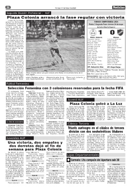 ca en la última posición Plaza Colonia se ubica Sub 14: alterado por el estado nes por dos unidades a Fútbol Femenino se dispu-